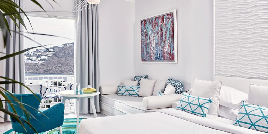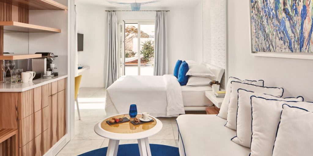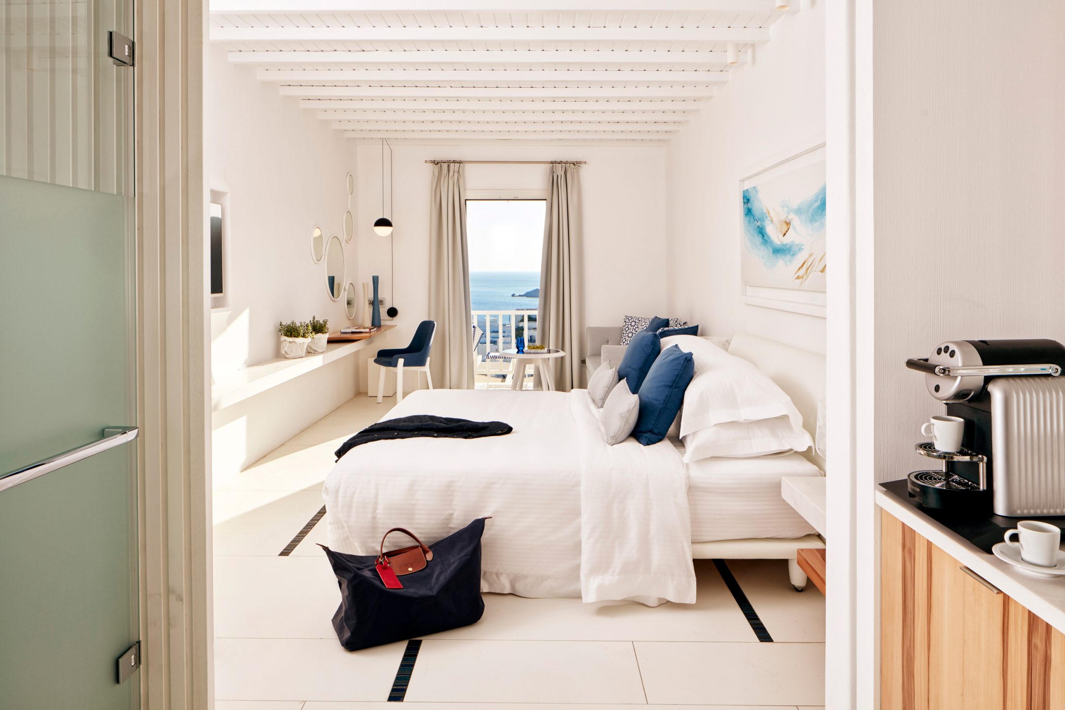 Spacious and inviting, this open-flow room extends to a private balcony or terrace overlooking the Aegean. White interiors, accented with blue and wood details, are paired with designer lighting for a luxurious ambiance. Choose between balcony or terrace with seating areas, private Jacuzzis, or private pools to create your perfect escape.